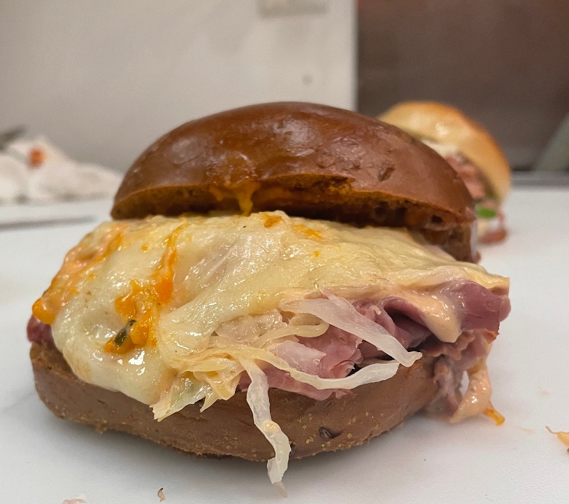 Pumpernickel Bagel with Corned Beef, Sauerkraut, & Melted Swiss Cheese!