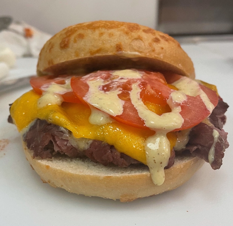 Asiago Bagel with Roast Beef, Melted Cheddar Cheese...topped withTomato & Homemade Honey Mustard!