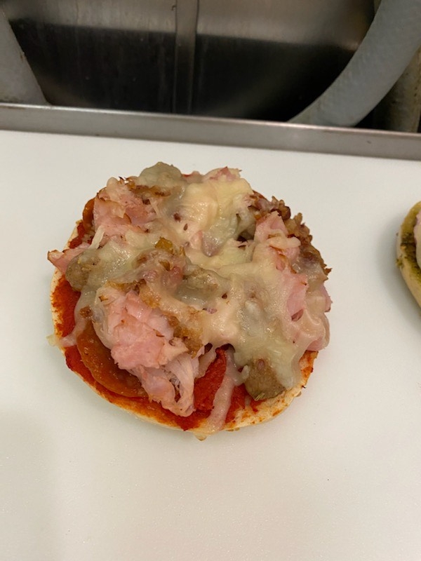 Pizza Bagel with Sauce, Cheese, Pepperoni, Sausage, Crumbled Bacon & Ham!