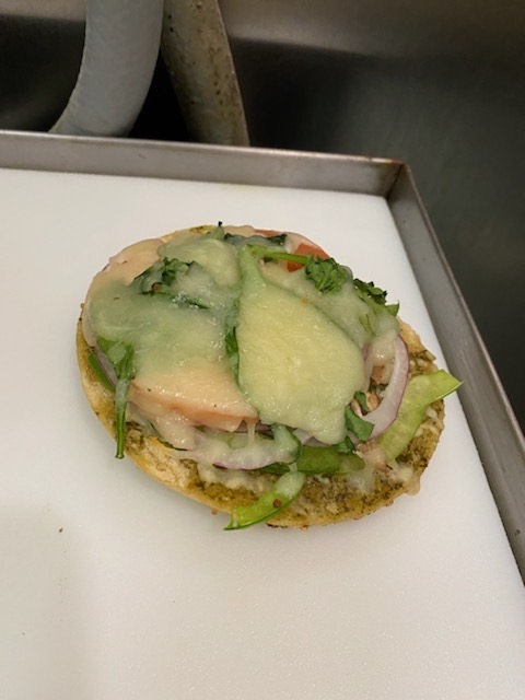 Pizza Bagel with Pesto Sauce, Onions, Peppers, Mushrooms, Spinach, Tomato & Mozzarella!