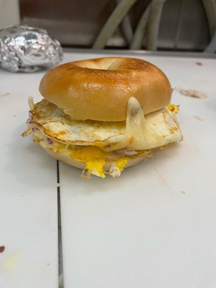 Egg & Cheese with Avocado & Red Onion on a NY Bagel